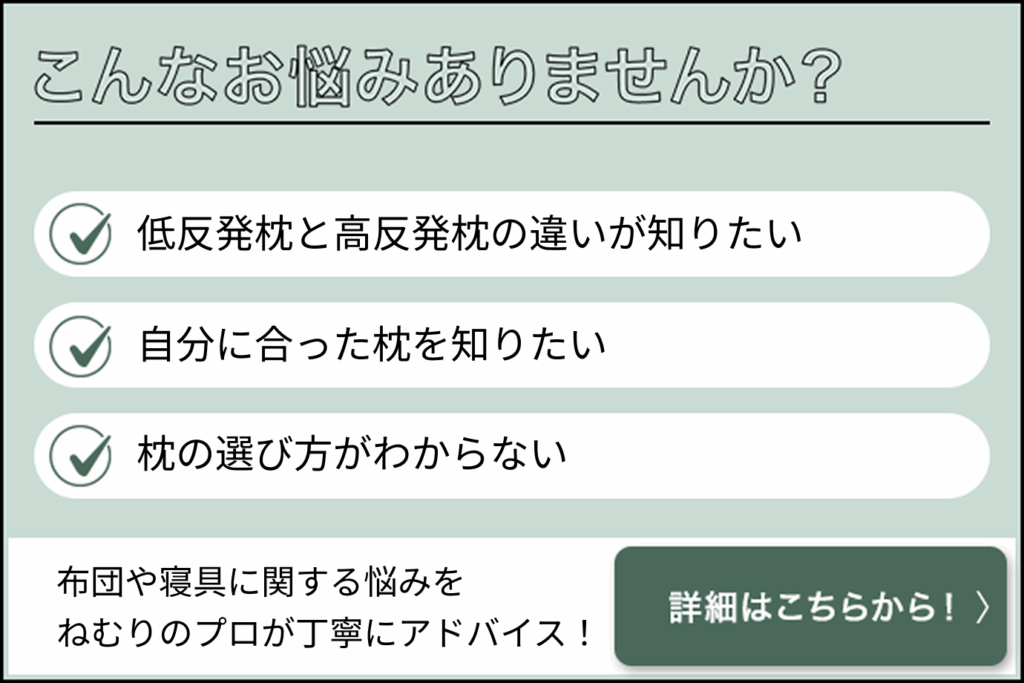 低反発枕と高反発枕のどちらを選べばよいかは、睡眠姿勢や体格、寝返りの頻度などによって変わります。自分で適切な枕が判断できないときは、ねむりの相談所に在籍するスリープマスターに相談する方法もおすすめです。